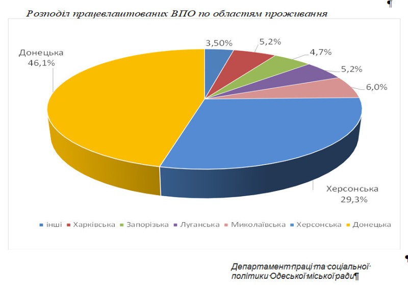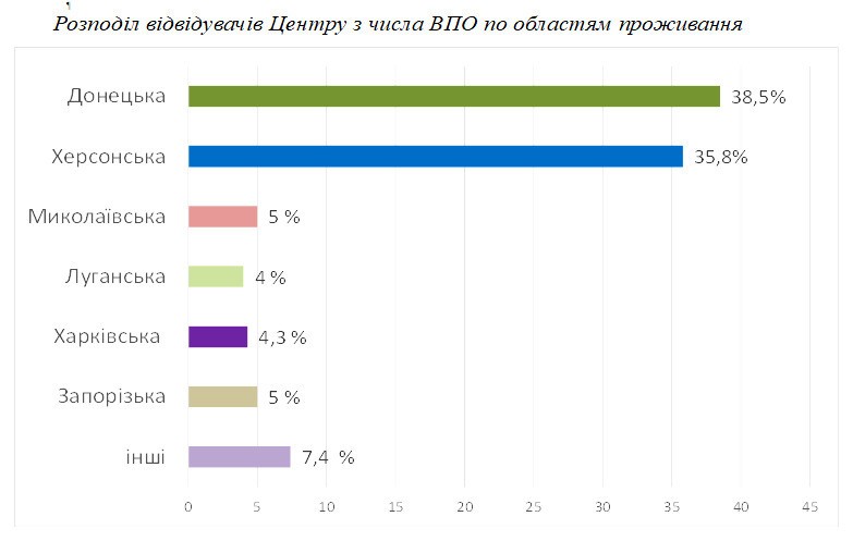 Наибольшую часть посетителей составляют переселенцы из Донецкой области. Вместе с выходцами из Херсона они составляют почти 75% всех, кто обращается за помощью. Доля трудоустроенных ВПЛ из этих двух регионов также превышает 75%.